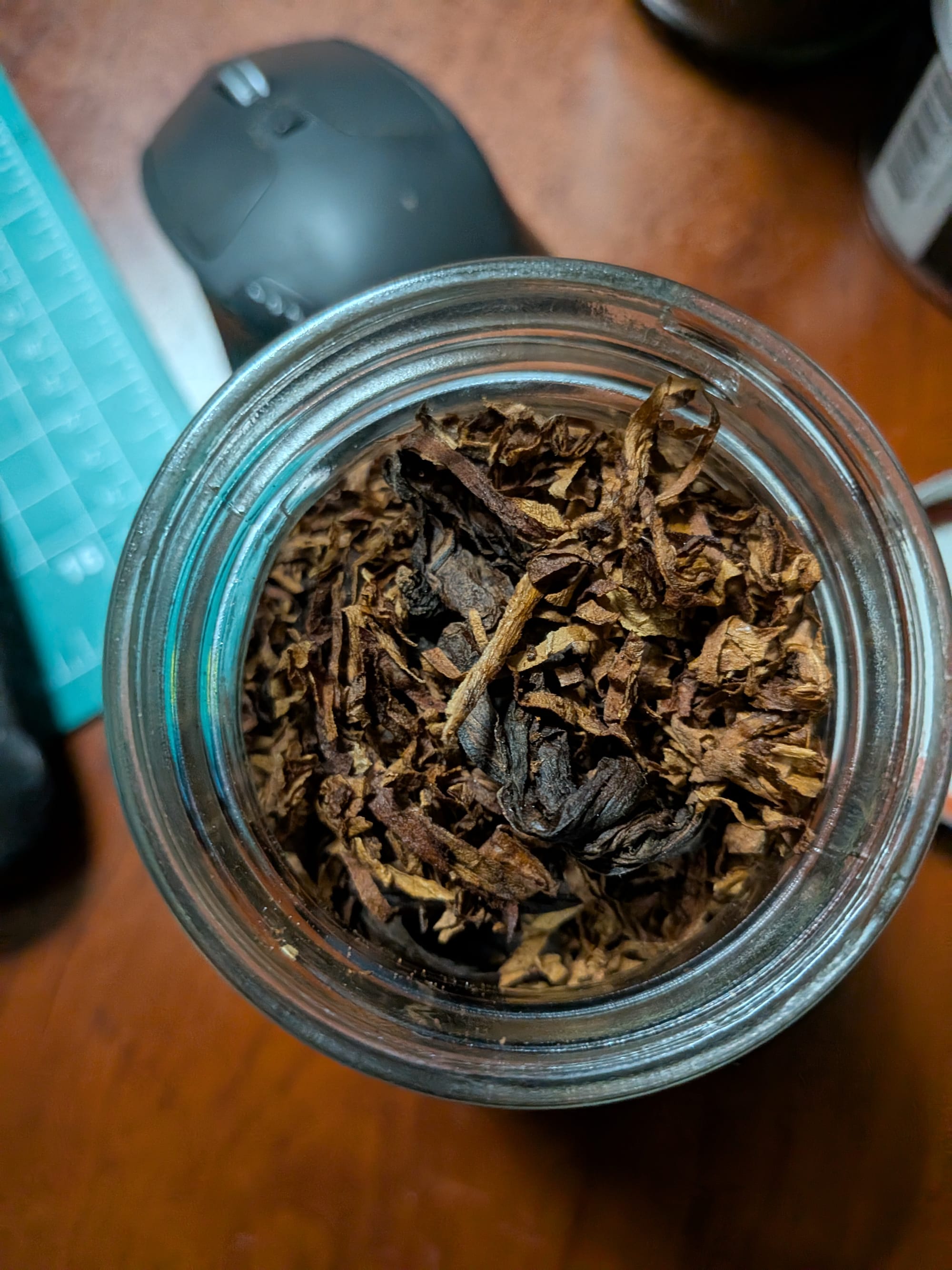 You can see the top of the whole leaf perique that is fished through the jar like a Zippo wick in cotton. The perique leaf is quite dry now as it seems the rest of the ribbon has sucked the moisture out of the leaf.