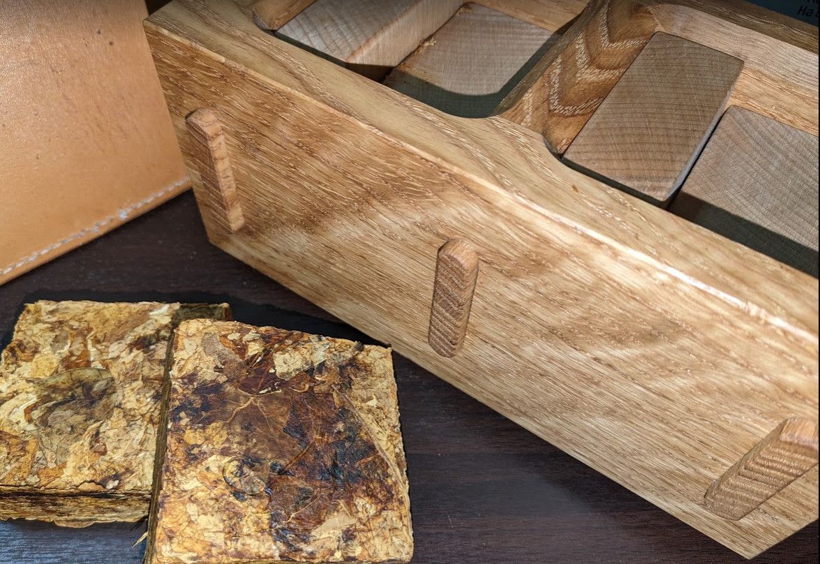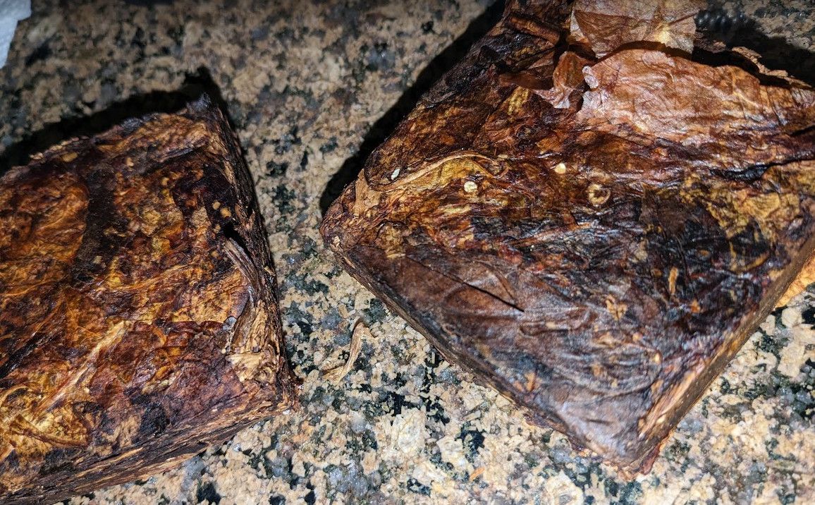 I got a wooden double press that UpArrow made on Pipe Smoker’s Den. This man is a true craftsman. I cannot say enough on the quality of his work. I decided to try the bright and red Virginia blend in the wooden press. It was dryer than I thought it would be but thinking back to Red Queen plug there wasn’t any wet perique in the blend so that makes sense. After pressing for week I pulled the two plugs and tried one immediately. Zero bite, which surprised me, and plummy and sweet smoke. I used the plum casing recipe I posted earlier. One of the plugs I placed in a mason jar and stoved it for 4 hours.