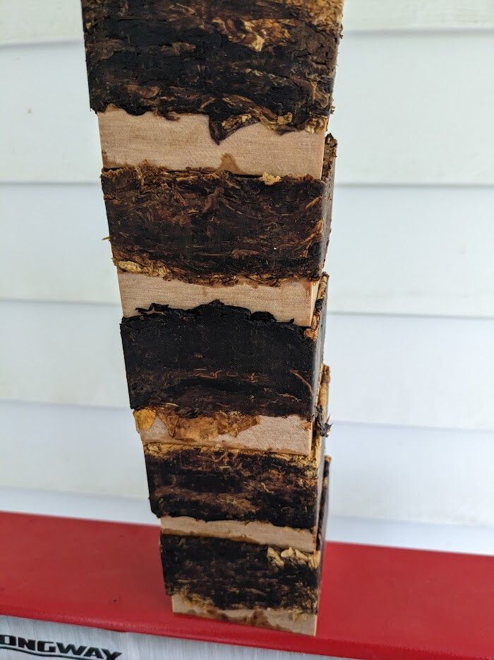 The frame press was a bit of compress and then find something to compress it further and further. I ended up using a piece of the 2″ dowel with a metal washer on the end to do the final compaction. If I did the math correctly each plug should measure just under 3″ x 3″ x 2.55″ thickness.