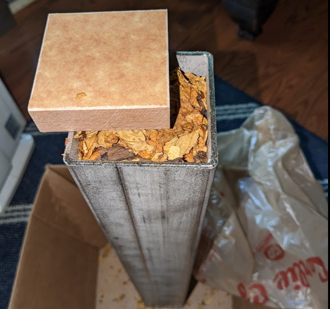 Pressing 1kg of whole leaf tobacco challenge. As they say, if it is worth doing it is worth doing to excess. I picked up a 2 foot long 3″ by 3″ square stainless steel tube (T43311) from Metals Depot. Next thing was to find spacers. I didn’t want to use wood since it would absorb moisture and I wanted something that I could stove the whole press at 200F. I found The Cutting Board Company makes a high temperature cutting board and you can specify the size. I got 3/4″ Richlite cut to 2 5/8″ x 2 5/8″ to fit the stainless steel tube.