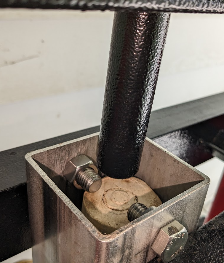 Unfortunately I don’t have a 1/2″ drill bit at the moment. So on to Plan C. I push the plates on just the edge of the pipe and was able to push out 2 of the plugs. I then used a 2″ dowel on the concrete and dropped the tube on it until the other 3 plugs came out. All in all it works but I will get those holes drilled for 1/2″ bolts for the next run.