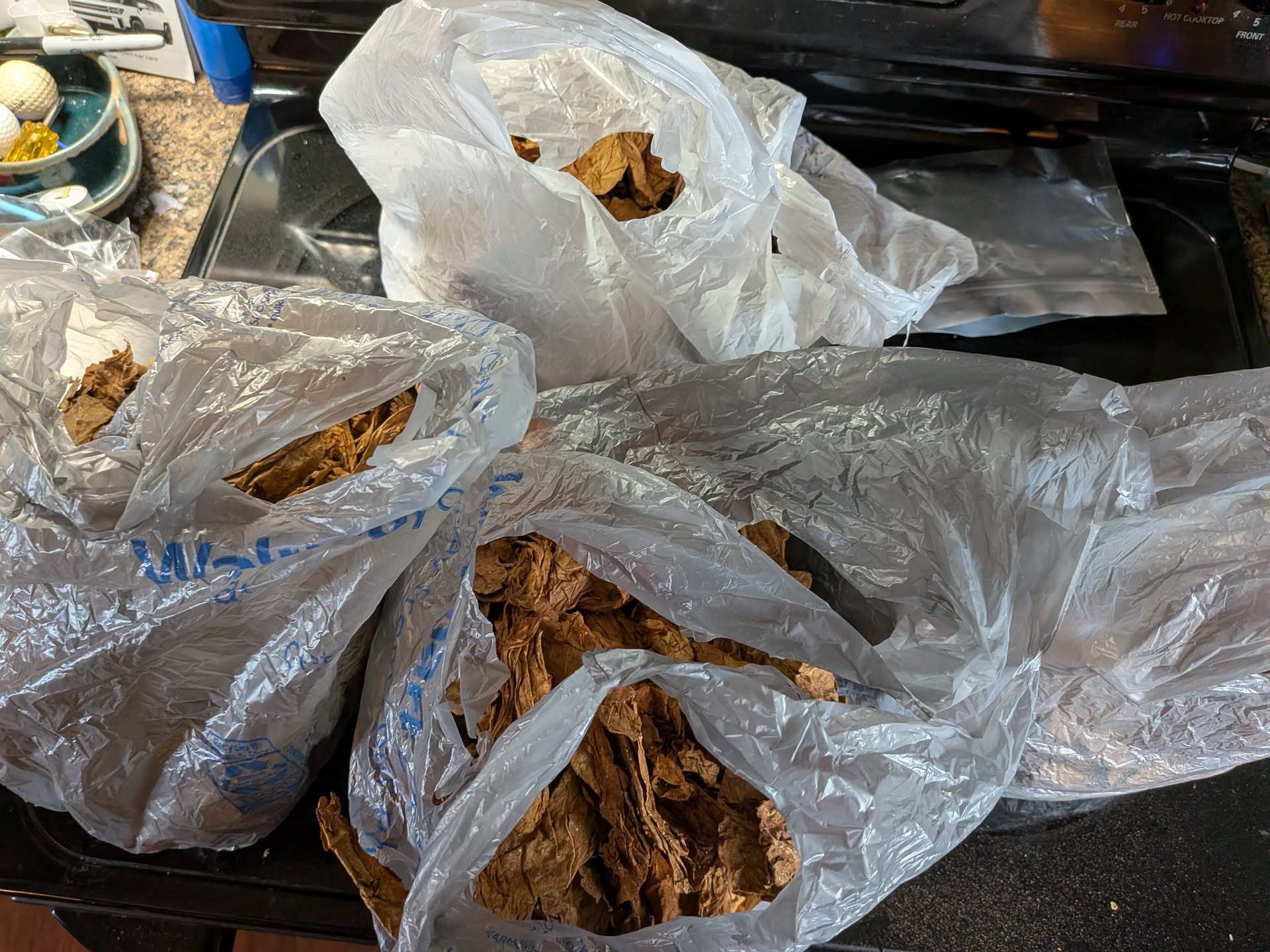 After stripping I put both in their own trash bags and mist 2oz of Blackberry Casing for each. Sorry, didn't picture that since my hands were sticky turning leaf and spraying!