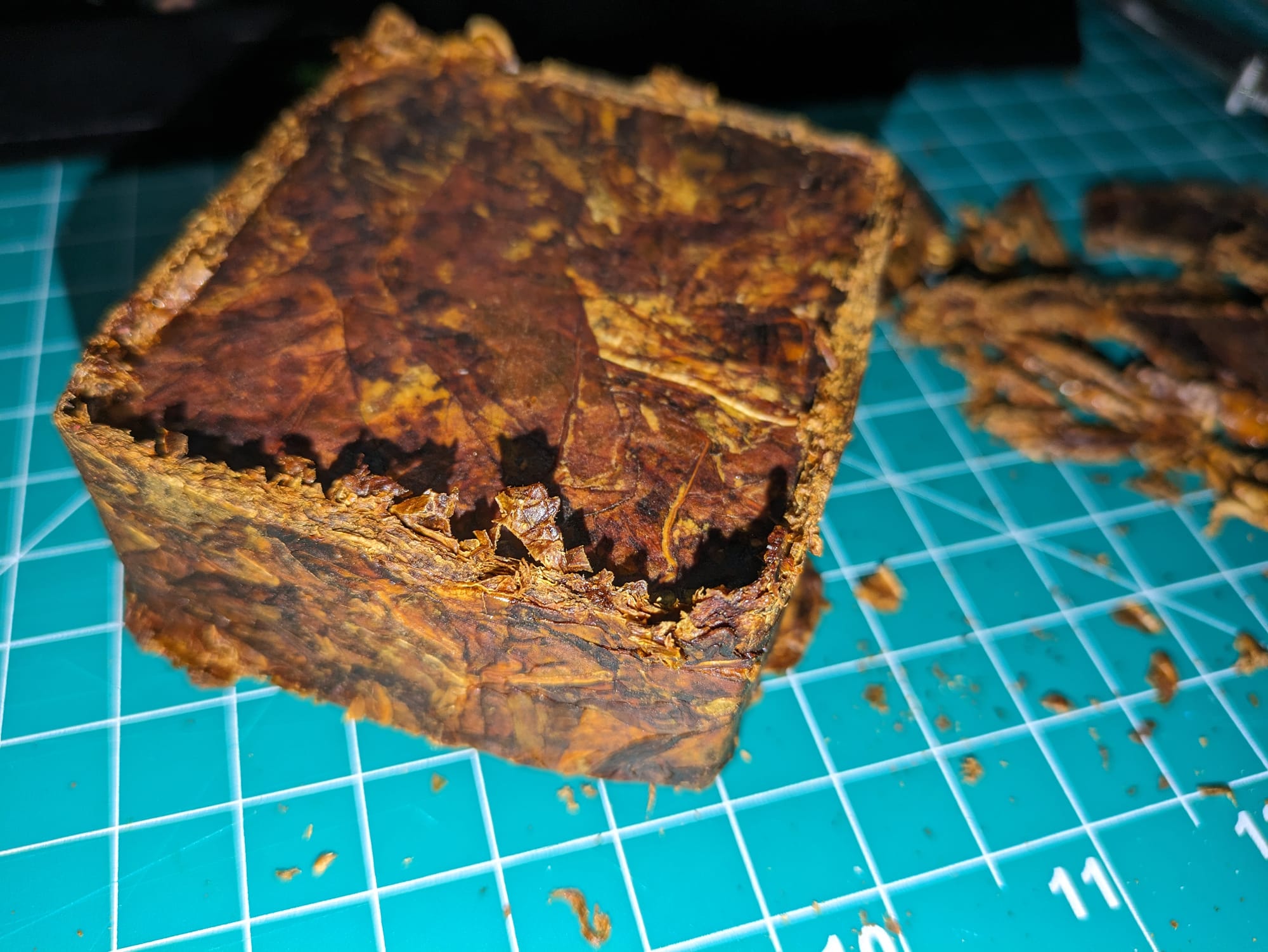 But let's try a slight variation on this recipe and do half lemon Virginia with tonka casing and half bright Virginia with blackberry casing. Also after de-stemming 2 lbs, I settled on doing 175g plugs which works perfect on the math. Basically 1 lb de-stemmed will yield two 175g plugs. For this run I will be doing the big press and do all 4 plugs at once. Next week should be a hot one here in North Carolina so I will let it stove in the cab of the truck next week while pressed.