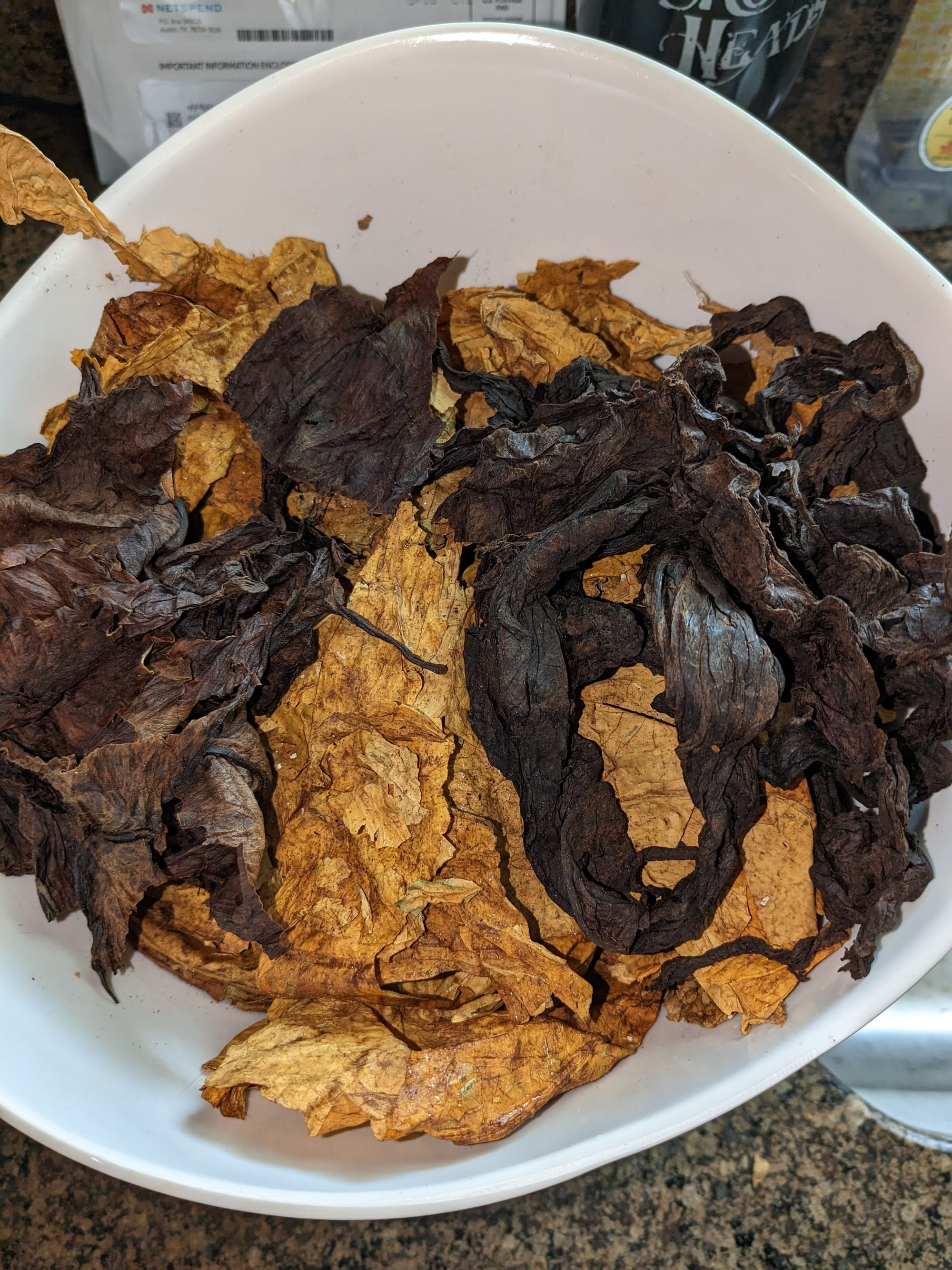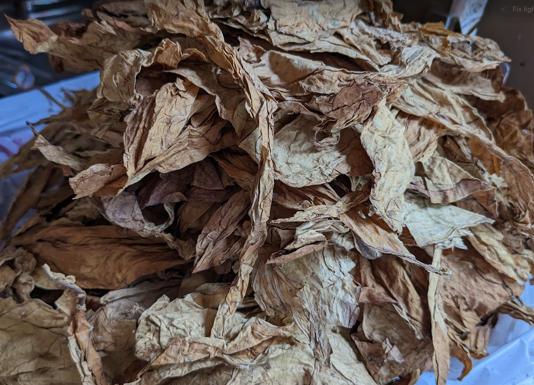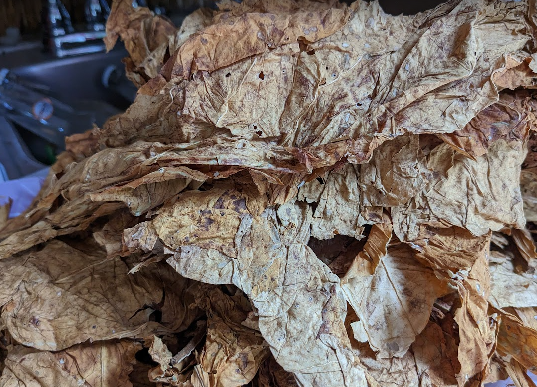 Whole leaf Virginia/dark fired Kentucky plug is the next experiment to perform. This is made with equal parts bright Virginia flue cured, red Virginia flue cured and dark fired Kentucky. All of these leaves were purchased from Whole Leaf Tobacco. First step is prepping the leaves.